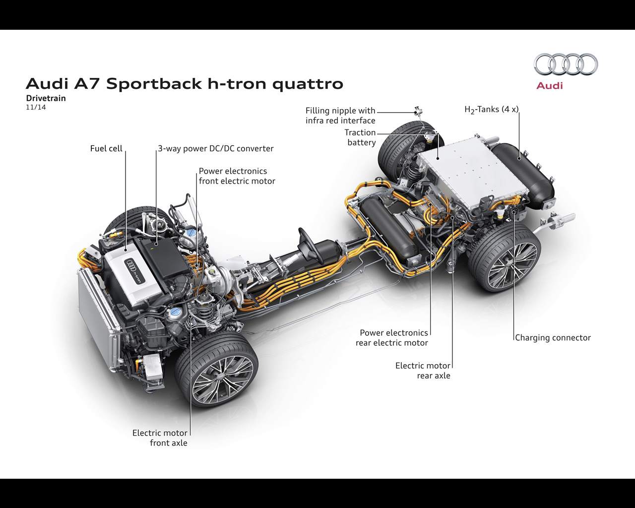 It sprints from 0 to 100 km/h (62.1 mi) in 7.9 seconds and on to a top speed of 180 km/h (111.8 mph). It covers over 500 kilometers (310.7 mi) on one tank of fuel – and its exhaust emits nothing more than a few drops of water: The A7 Sportback h-tron quattro, which Audi is unveiling at the Los Angeles Auto Show 2014, uses a powerful, sporty electric drive with a fuel cell as its energy source that operates in combination with a hybrid battery and an additional electric motor in the rear. The overall electrical system power of 170 kW is transferred to both the front and the rear wheels. This drive configuration makes the emission-free Audi A7 Sportback* a quattro through and through – a new departure in fuel cell cars.
