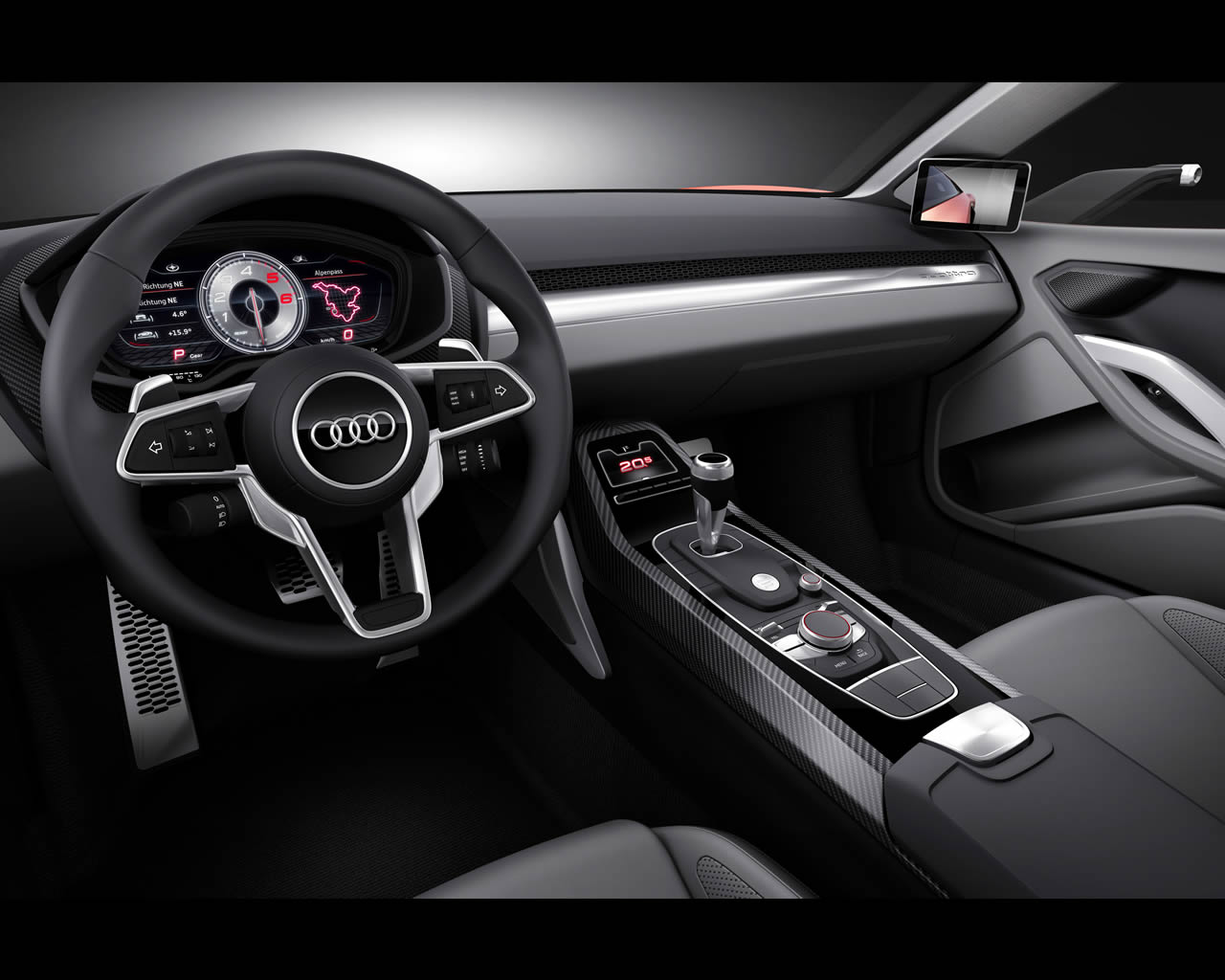 The interior of the Audi nanuk quattro concept has been reduced to the essentials. The architecture revolves around the instrument cluster. A carbon island accentuates the cockpit and provides for a clear driver focus. The instrument panel seems to float and emphasizes the horizontal lines and the width of the car. It is supported by aluminum stirrups at the center console, which have soft pads as leg rests. Besides numerous storage compartments, there is also a holder made of a soft material in the scissor doors. |