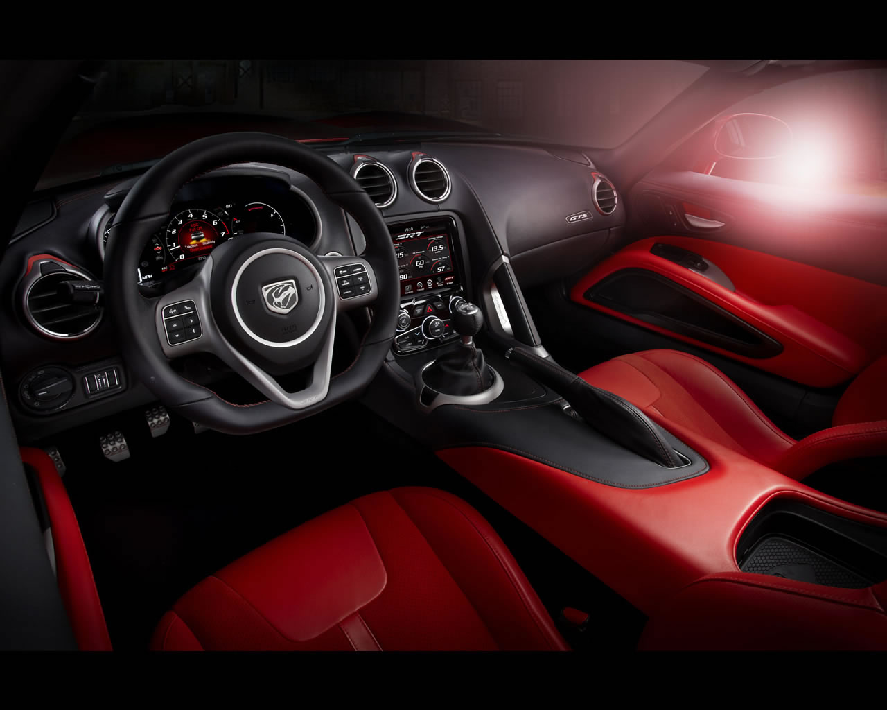 Two road legal models include SRT Viper and SRT Viper GTS coupe. All-aluminium, front mid-engine naturally aspirated 8.4 liter V10 delivers an estimated 640 hp and 600 lb.ft of torque. The Tremec TR6060 six-speed manual transmission has been improved with a shorter throw shifter, closer gear ratios and a final drive ratio that has been shortened to 3.55 from 3.07. The 2013 Viper models will be more engaging to drive and top speed is now achieved through 6th gear with maximum engine speed (redline) at 6,200 rpm.