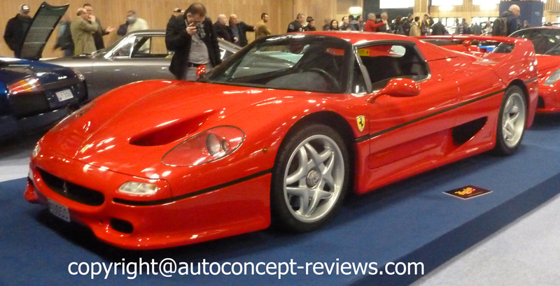 The Ferrari F50 was introduced at the 1995 63rd Geneva Motor Show by Luca di Montezemolo in the presence of Niki Lauda for the 50th Anniversary of the Company . It followed the Ferrari F40 propelled by a turbo V8 . The Ferrari F50 was proposed with a 520 hp 4,698cc V12 with Bosch Motronic 2.7 engine management. The transmission included a six-speed manual gearbox. There was a four-wheel independant suspension with coil springs and unequal lenght wishbones and four wheel hydraulic disc brakes.