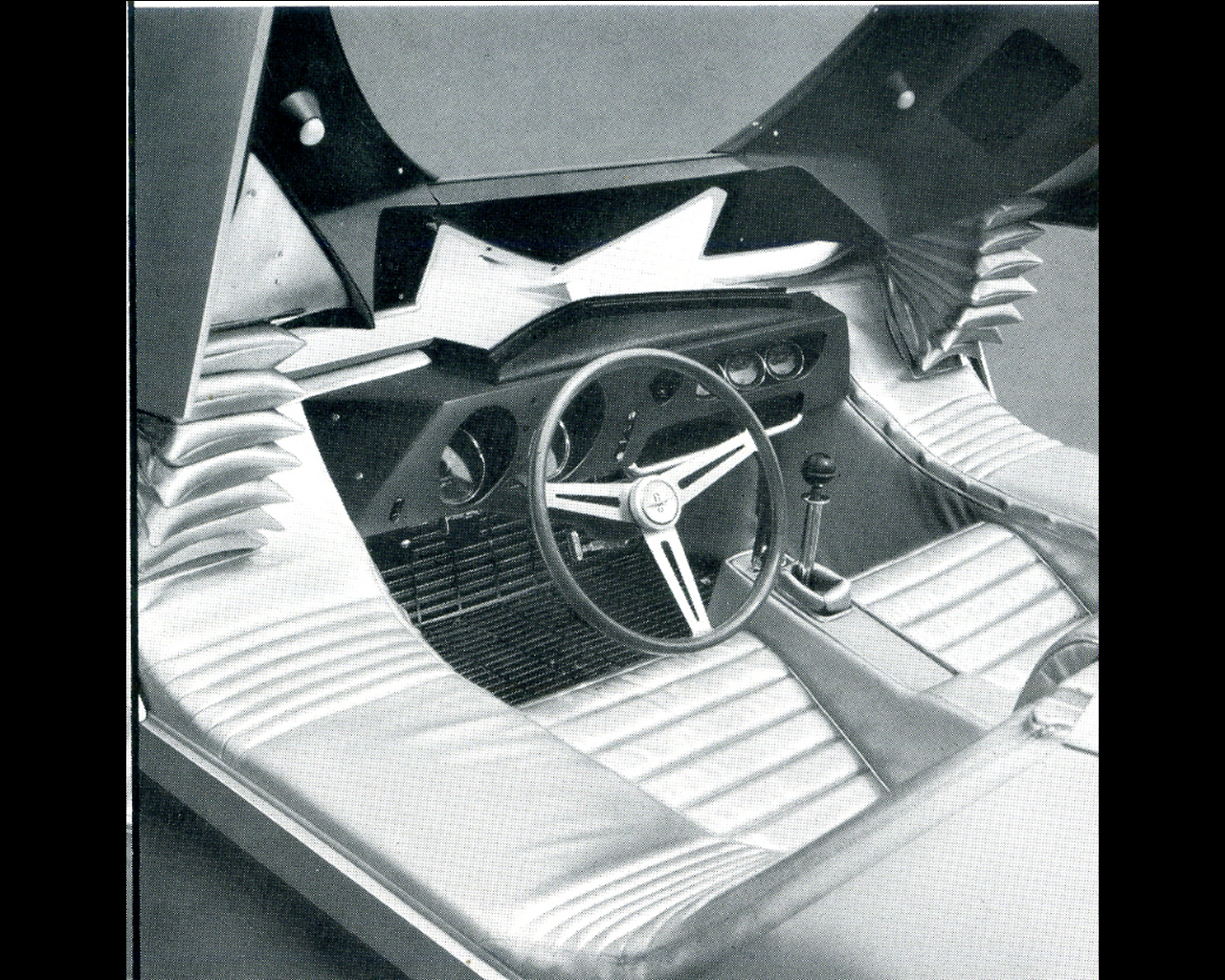 The body styling was developed in wind tunnel for streamlined aerodynamically optimized shape. The styling design was conceived by Larry Shinoda and Tony Lapine under the Direction of Bill Mitchell. Both the Corvair Monza GT and SS Spyder have steeply reclined contour seats with the seat-back at 45° angle and adjustable cushioned headrests. The seats are fixed and integrated in the platform. Adjustment of the driving position is made by steering wheel position and foot pedal holder setting. Steering wheel has a unique hub design that allows it to be removed entirely to facilitate entry and exit. Forward visibility is virtually unlimited through pillar-less canopy, which is painted on the top to reduce glare. Instrument panel finish is dull black-crackle for freedom from reflections. Functional instrumentation includes a large tachometer and speedometer plus gauges for oil pressure, fuel supply status, and engine temperature.