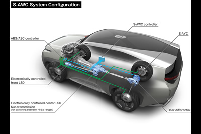 In this new application, S-AWC is based on a full-time 4WD system including a rear differential + an Electronically-controlled Limited Slip Differential (LSD) at the front + another Electronically-controlled Limited Slip Differential in the center + an Electric-Active Yaw Control (E-AYC) unit at the rear. The latter uses torque from the electric motor to precisely control torque distribution to each rear wheel, providing excellent vehicle stability.