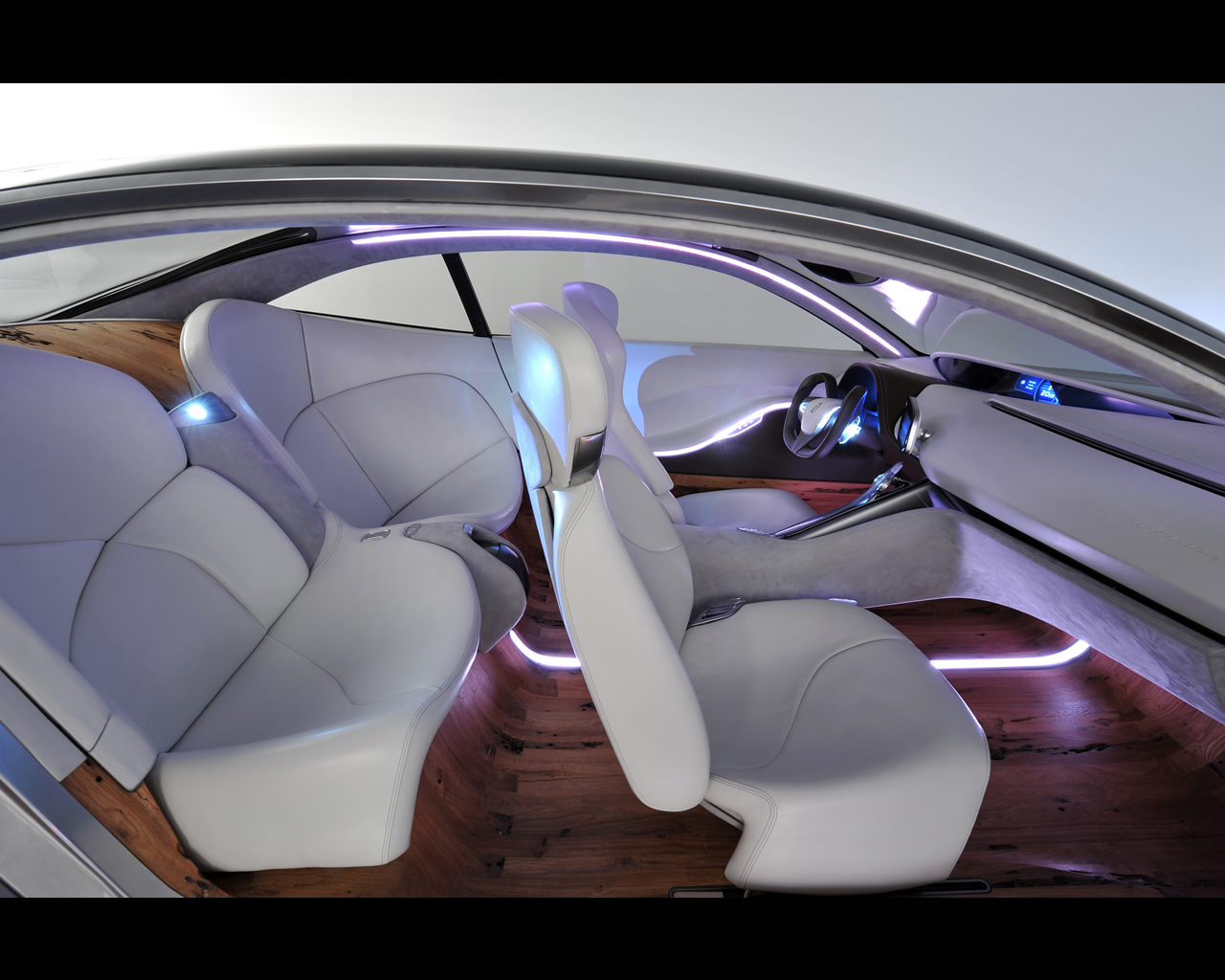 The Cambiano illustrates Pininfarina expertise in Car Styling Design and Engineering. The sports saloon body style presents a different solution on each side. The driver side has a single door of a sports coupe while the passenger side has two doors that open from the centre and no B-pillar for a full access to the cabin. The body of the car is one of simple, solid volumes, with large taut but sensual surfaces, enhanced by the golden grey colour and iridescent blue reflections. The metal inserts in the sides are a new take on decorative mouldings and they continue all along the side glazing, incorporating the lighting and opening functions of the doors. The light is an integral part of the Cambiano design concept, inside and out. The relationship with natural light is simplified by the panoramic roof, which is translucent in some areas and transparent in others. With a carbon honeycomb structure mounted between the outside glass and a polycarbonate inner lining, the roof enhances visibility in the car – heightening the sense of luminosity and space inside