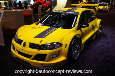 The Renault Megane Trophy was unveiled at the 2004 Mondial Paris Auto Show. The Megane Trophy weights 950 kg and is propelled by a 320 hp 24 valves 3.5 Litre V6 connected with a semi-automatic six speed transmission. The Renault Megane Trophy was prepared by Renault Sport Technologies and was intended for a single car special racing series begining in 2005. ( Group Renault Annual Report 2004)