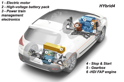 Peugeot and Citroen will enter this market in 2011 by the Hybrid4 solution. The Hybrid4 technique retains the existing combustion propulsion on the front axle and adds an electric motor for the rear axle. A set of battery is installed to supply the electric propulsion. An electronic control will coordinate the harmonious operation of the combustion engine and the electric propulsion.