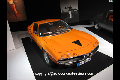 The Alfa Romeo Montreal was prepared with Bertone as a prototype for the 1967 Montreal Universal Exhibition. It used the Alfa Romeo V8 engine of the 33 Stradale. The weight distribution is 60% on front and 40% on the rear axle as the engine is positioned at the front end and the air intakes behind side window are ornamental. After three year of development the Alfa Romeo Montreal entered production. 3.925 cars were produced between 1970 and 1974.