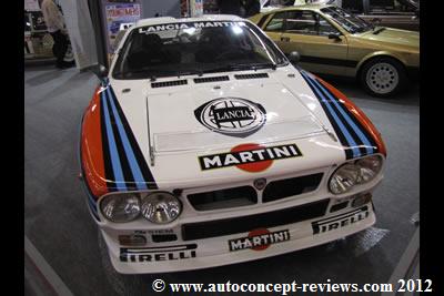 The homologation in Group B by FIA requested the production of at least 200 examples of the car in road legal version. At Retromobile 2012 it was possible to see both the road legal version and the Rallye competition version. A red Lancia Beta 037 Stradale was eventually sold for 191.000 Euros at the Artcurial Auction. The Competition 037 was displayed by Youngtimers. The Group B had a central monocoque structure with front and rear tubular frames to support the mechanical elements. The 4 cylinder mid-ship mounted engine with 1995 cc produced 325 hp at 8500 rpm with an Abarth compressor. Claimed weight was 960 kg for competition 037 and 1170 kg for the Stradale road legal example. A Lancia 037 Group 5 even participated and finished in 15th position at 1981 24 hours of Le Mans with Finotto, Pianta and Schon at the wheel.